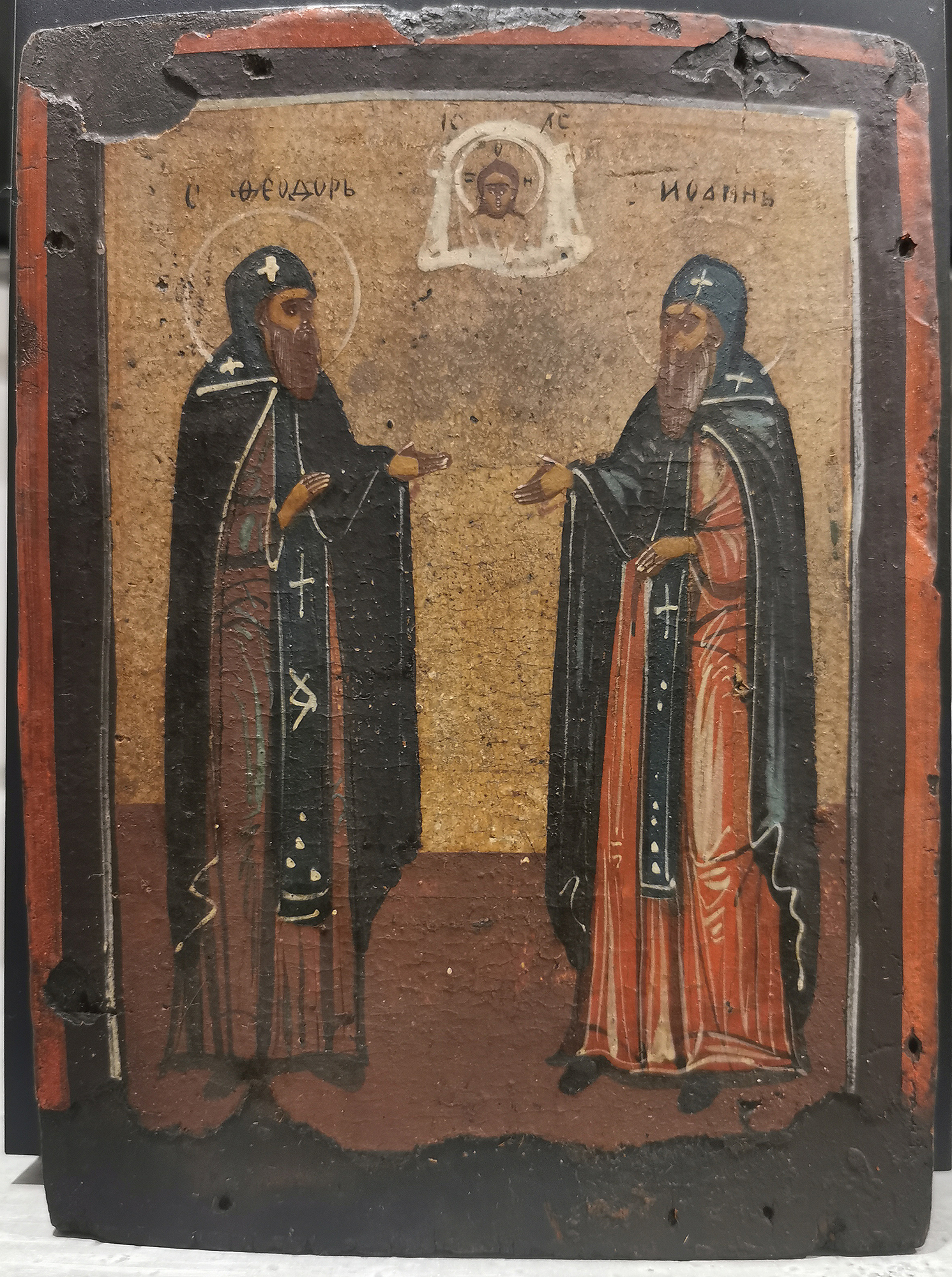 Преподобные это монахи, могут быть простыми, могут быть священиками (т.е. могут совершать литургию) из которых могут назначаться высшые должности епископов, архиепископов, митрополитов и патриархов. Епископы именуются святителями. И обычно изображаются в спец священических одеяниях. Теперь по иконе. Соловецкие преподобные ничем кроме Соловков не связаны и нет какой либо причины изображать их вместе вроде нет кроме прихоти заказчика. Меня смушает наличие буковки "С" перед именами как вроде указывает на святителей хотя одежды простые монашеские не святительсие. Святители Феодор и Иоанн, Суздальские часто упоминаются вместе https://www.pravoslavnaya-biblioteka.ru/molitvoslov/molitva-svyatitelyam-feodoru-i-ioannu-rostovskim-i-suzdalskim.html https://православный-молитвослов.рф/kanon/minea_sentabr/kan_2sent_feodor.html https://viewer.rusneb.ru/ru/000199_000009_003547123?page=3&rotate=0&theme=white В конце 19 в для их мощей были изготовлены новые раки (кажется с разницей в 2 года), возможно под это и была написана икона. Почему не святительские? Может богомазу было лень и некогда писать специально, а взял с двумя преподобными и подписал под заказчика. Письмо низкое, посмотрите где бытовала икона из каких мест появилась у Вас. |